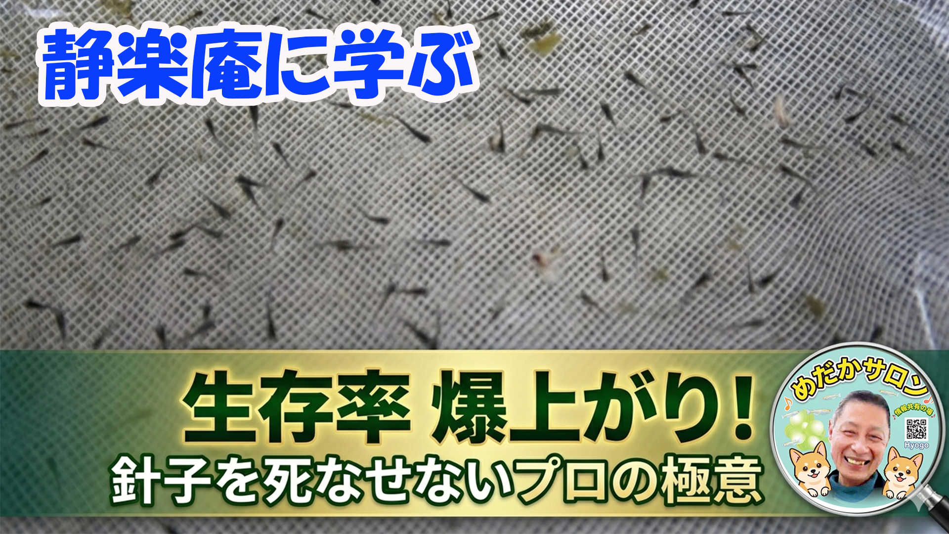 メダカの生存率を高めるための重要ポイントを静楽庵信請さんから説明していただきました。産まれた針子の命を大切に育てるためにはどうすればよいでしょうか。それは針子にとって良い環境を維持することで、良い環境とは、第一に水温が安定することだとおっしゃっています。長年の経験から培われた静楽庵流の針子飼育法を収録していますので、この機会にぜひ、ご覧ください。